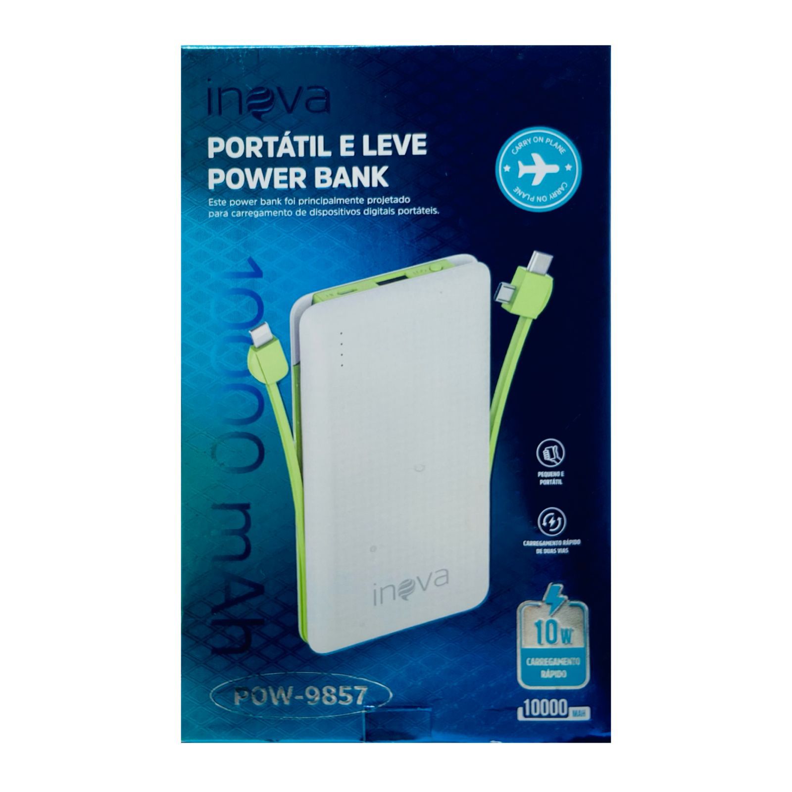 Carregador Portátil 10.000 mAh Inova. Acompanha cabo com ponta para carregamento Micro USB/V8, Tipo-C e Lightning, além de 1 saída USB-A. Portátil e leve. Produto Original, homologado pela Anatel.